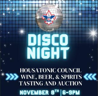 On Saturday November 8th, the Housatonic Council, Scouting America (dba the Boy Scouts of America) is hosting a Disco themed night of Wine, Beer and Spirits Tastings, with food and a large Auction.  All proceeds from the event will be used to benefit Scouts in Ansonia, Derby, Oxford, Seymour, and Shelton, through Council's programs and camp at Edmund D. Strang Scout Reservation in Goshen, CT.
